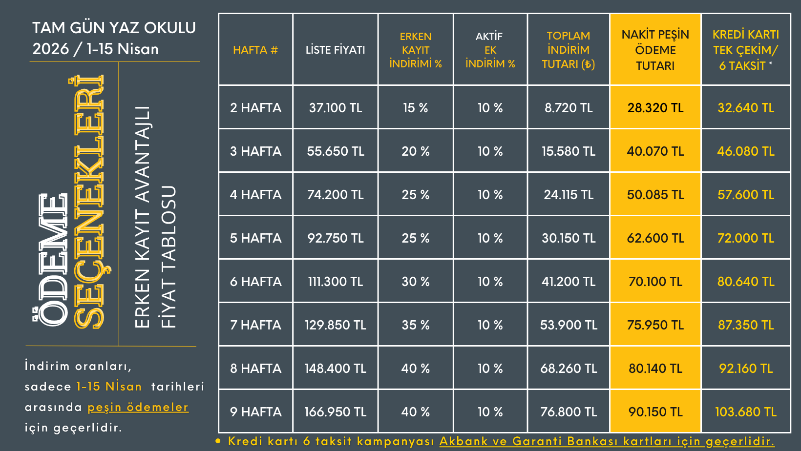 - Tabloda belirtilen ve indirim tutarları, 1-15 Nisan 2026 tarihleri arasında geçerlidir.
